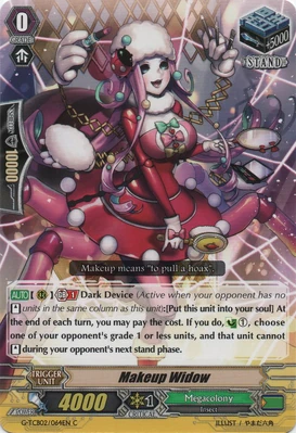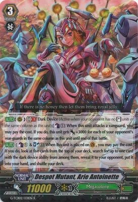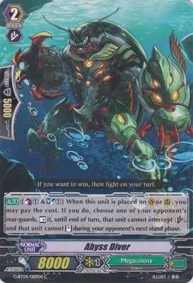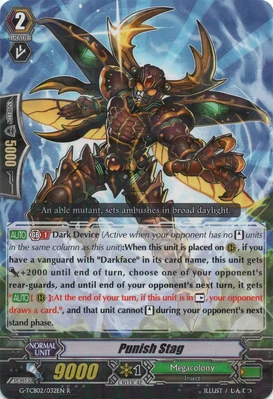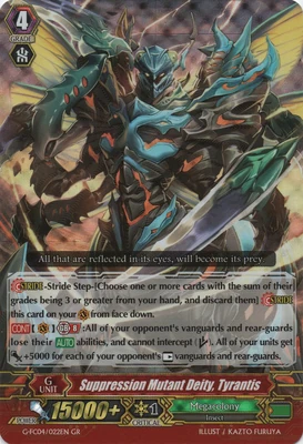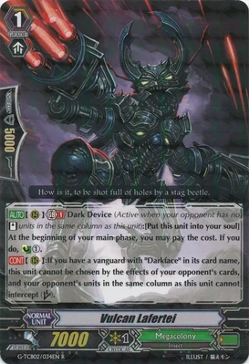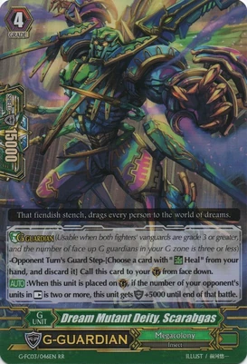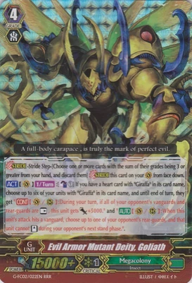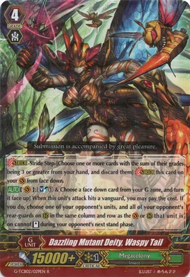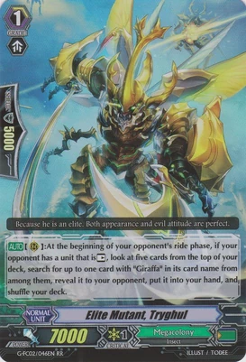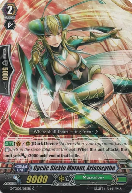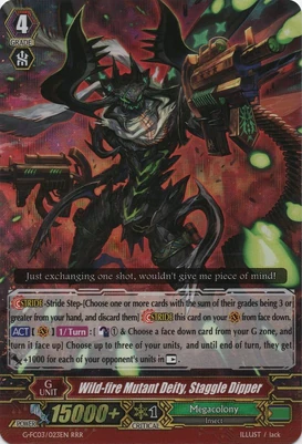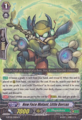 При призыве в авангард этот воин усыпляет арьергард, находящийся за авангардом оппонента, а при призыве в арьергард усыпляет оппоненту целую колонку. Однако, способность слишком одноразовая и дополнительных плюшек не имеет, в отличии от того же Intimidating Mutant King, Darkface Alicides, да и нужного имени нет, так что не вариант.