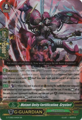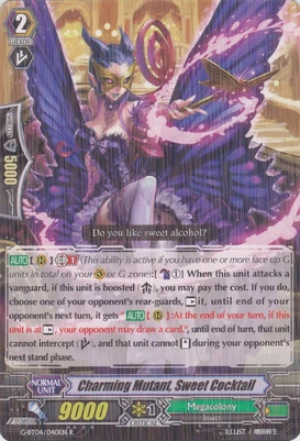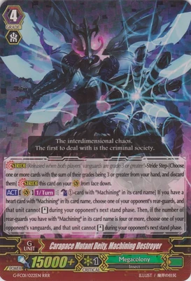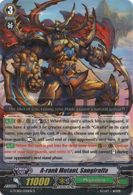 | Эффект: | АВТО 【Авангард】 Разрыв лимитов 4 (данный эффект доступен лишь при наличии хотя бы четырёх очков урона): когда поверх этого воина призывается кто-либо из клана «Megacolony», до конца хода сила Вашего авангарда увеличивается на 10,000. К тому же, переставьте всех воинов оппонента в спящее положение и во время следующей фазы подъёма оппонента эти воины не могут подняться в бой. ПРОДОЛЖИТЕЛЬНЫЙ 【Авангард】: во время Вашего хода, если все воины оппонента находятся на отдыхе, сила данного воина увеличивается на 2,000. ПРОДОЛЖИТЕЛЬНЫЙ 【Авангард/арьергард】: лидер (если у Вас на поле находится кто-либо, не относящийся к клану этого воина, данный воин не может атаковать.) |