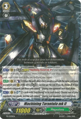 Полностью самодостаточный архетип, который не то что не нуждается в воинах со стороны, а ещё и зависит от родных, архетипных воинов. Что же касается стратегии, то Механасекомые, как и остальные клановые колоды, парализуют арьергарды оппонента, но есть и одно огромное отличие: Механасекомые парализуют ещё и авангард оппонента [этим занимаются Carapace Mutant Deity, Machining Destroyer и Oppression Mutant Deity, Machining Despot], что очень мощно, если у оппонента нет 3го ранга в руке, ибо заставляет его каждый ход сменяться или оставаться без атака авангарда. Даже если оппонент сменился, ему нужно ещё как-то за вознесение заплатить. И даже если он это сделал, рано или поздно 3тьи ранги у него в руке закончатся. К тому же, архетип может создавать колонки по 21,000+ и делать какие-никакие, но плюсы на поле/в руке. Правда, стоит признать, что против колод, которые очень много карт набирают или очень сильным контролем обладают, может прийтись весьма трудно, но в целом, архетип очень неприятный [для оппонента, разумеется].
