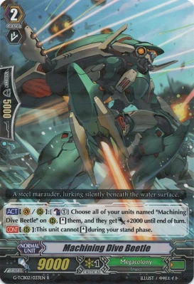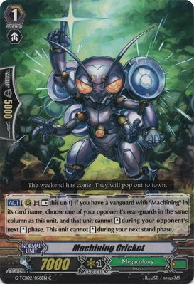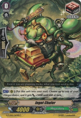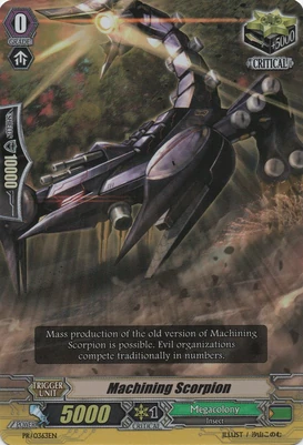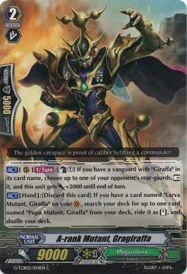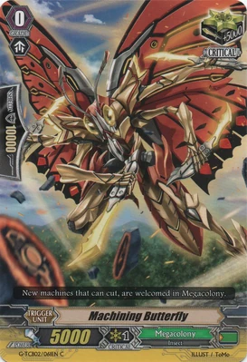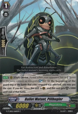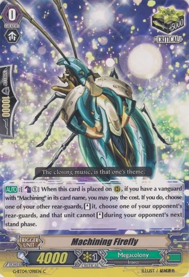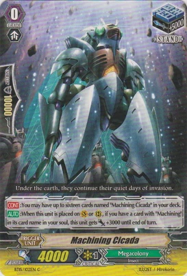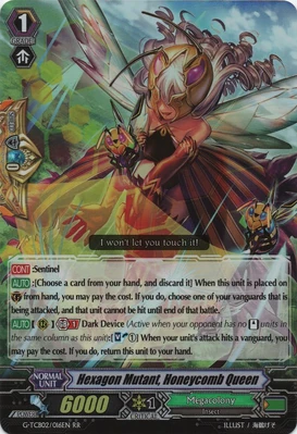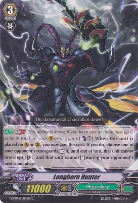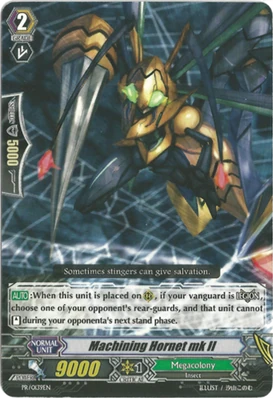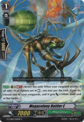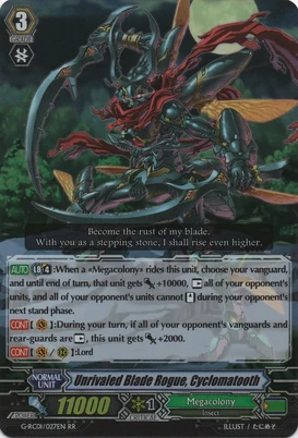 | Эффект: | АВТО 【Авангард/арьергард】: когда атака этого воина достигает авангарда оппонента, если у Вас в арьергарде находятся четыре или больше других воинов, относящихся к клану «Megacolony», возьмите одну карту из колоды. | |