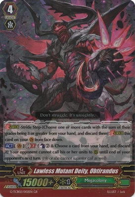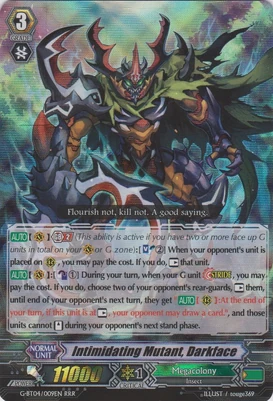2. Темноликий же, как правило, играет через Lawless Mutant Deity, Obtirandus, а карты тянет способностью при вознесении, также, играет как минимум восемь поднимающих триггеров, первым делом из-за их возможности восстанавливать ресурсы и уходить в душу для Импульса наследия 2 этого самого Intimidating Mutant, Darkface.