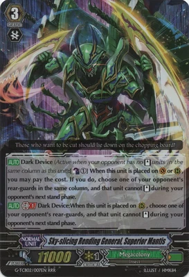 По сути, это ухудшенный Sky-slicing Rending General, Superior Mantis. А раз сам Sky-slicing Rending General, Superior Mantis ненужен, ибо недостаточно хорош, то что уж об этом воине говорить, который ещё и слабее?