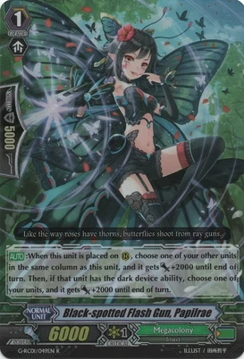 | Эффект: | АВТО: когда этот воин призывается в авангард или же в арьергард, откройте верхнюю карту своей колоды. Если она окажется воинов клана «Megacolony» – Вы можете призвать этого воина в арьергард. Если же нет – карта возвращается в колоде и перемешивается. | |