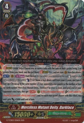 | Эффект: | АВТО: когда этот воин призывается в авангард или же в арьергард, выберите у себя в руке одну карту и Вы можете раскрыть её. Если в имени раскрытой карты или в имени Вашего авангарда не содержится “Darkface”, до конца хода сила данного воина снижается на 5,000. ПРОДОЛЖИТЕЛЬНЫЙ 【Арьергард】: если у Вас в авангарде находится воин 4го ранга, в имени которого содержится “Darkface”, и у оппонента в стоячем положении находится как максимум один воин, сила данного воина увеличивается на 6,000. |