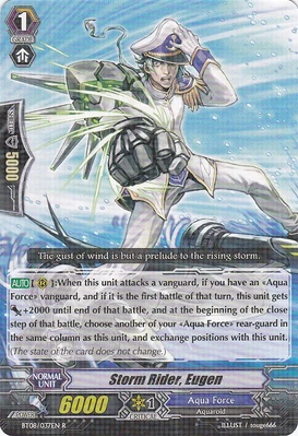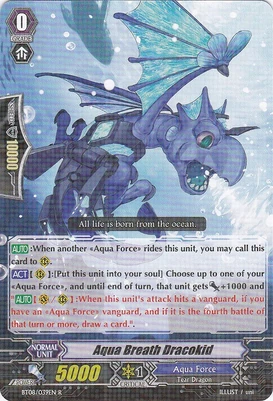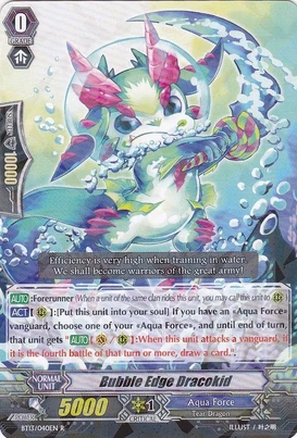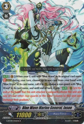 | Эффект: | АВТО 【Авангард】: когда при проверке эффектов Вам попадается воин клана «Aqua Force» 3го ранг, Вы можете выбрать одного находящегося у Вас в арьергарде воина и поднять его в бой. |
