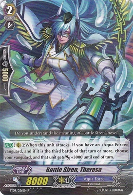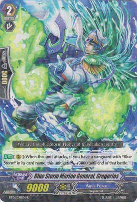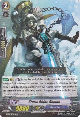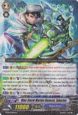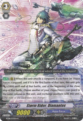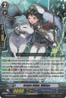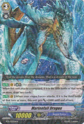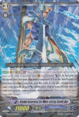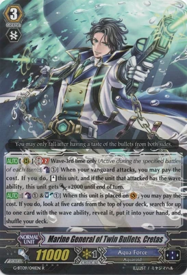 | Эффект: | АВТО 【Авангард】: Разрыв лимитов 4 (данный эффект доступен лишь при наличии хотя бы четырёх очков урона): когда этот воин атакует авангард оппонента, если это уже как минимум пятая битва в ходу, возьмите две карты из колоды. АВТО 【Авангард】: когда Ваш воин клана «Aqua Force» атакует и это уже как минимум третья битва в ходу, до конца хода сила данного воина увеличивается на 2,000. |