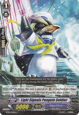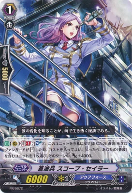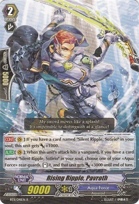 | Эффект: | АВТО 【Авангард/арьергард】: когда этот воин атакует авангард оппонента, если Ваш авангард относится к клану «Aqua Force», до конца битвы сила данного воина увеличивается на 2,000. |