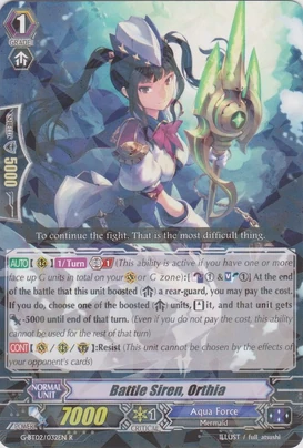 | Эффект: | АВТО 【Арьергард】: когда атака этого воина достигает авангарда оппонента – выберите одного своего воина клана «Aqua Force»; до конца хода его сила увеличивается на 3,000. | |