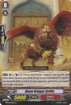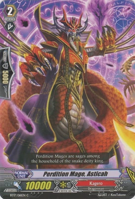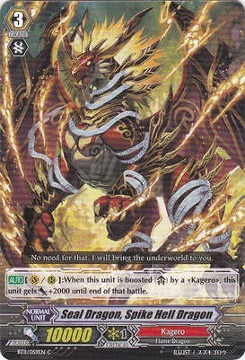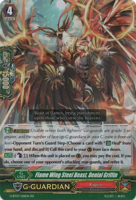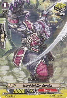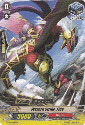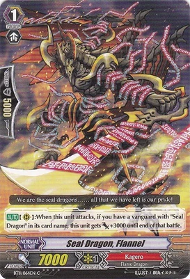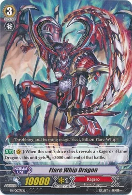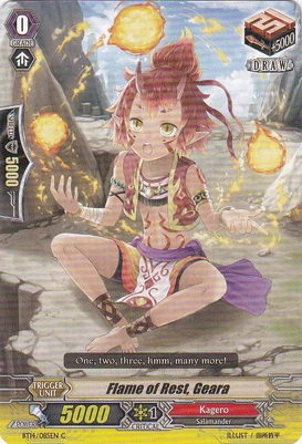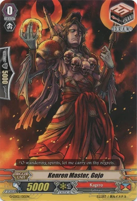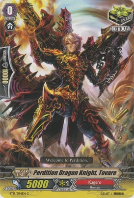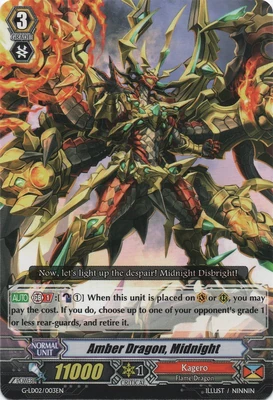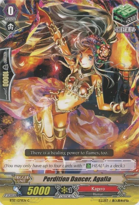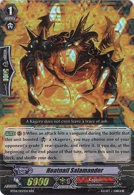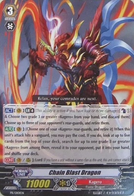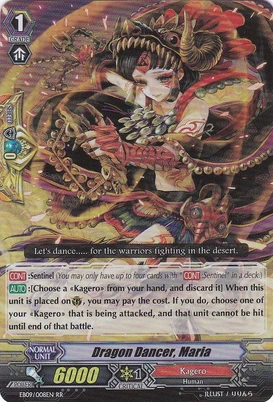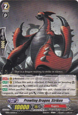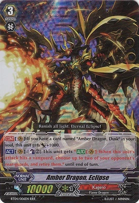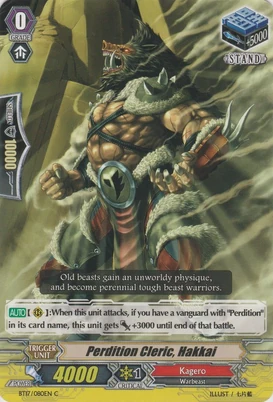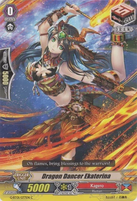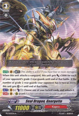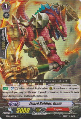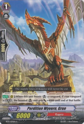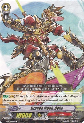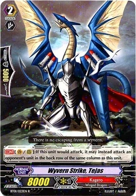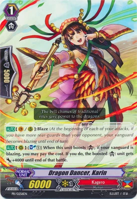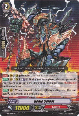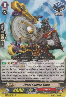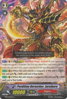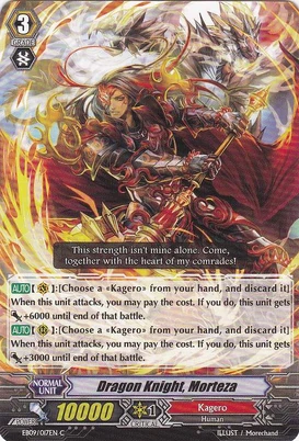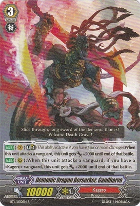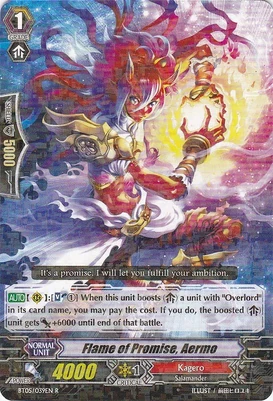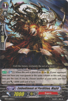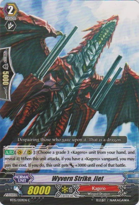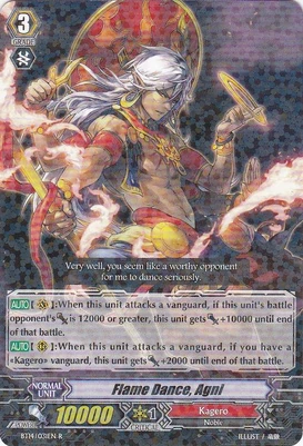 | Эффект: | АВТО 【Авангард】: когда этот воин атакует авангард оппонента, если у цели атаки как минимум 12,000 силы, до конца битвы сила этого воина увеличивается на 10,000. АВТО 【Арьергард】: когда этот воин атакует авангард оппонента, если Ваш авангард относится к клану «Kagero», до конца битвы сила данного воина увеличивается на 2,000. |