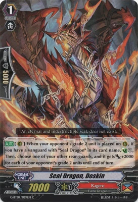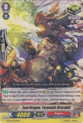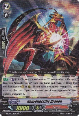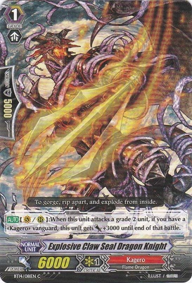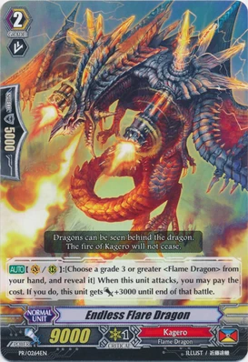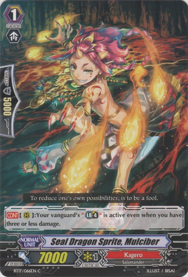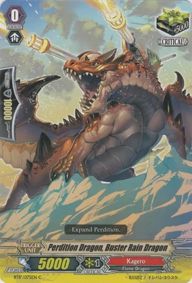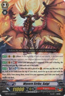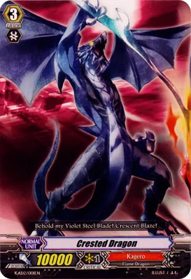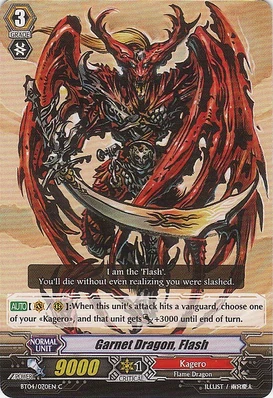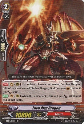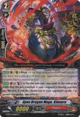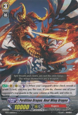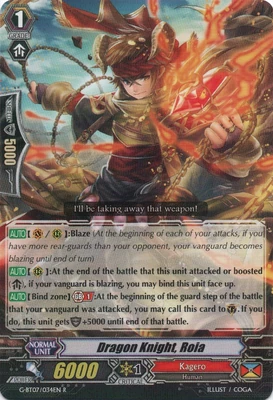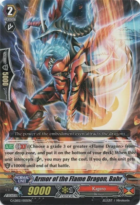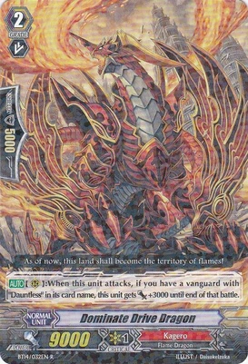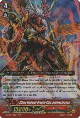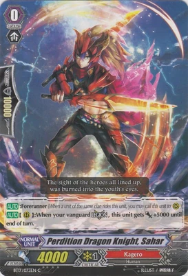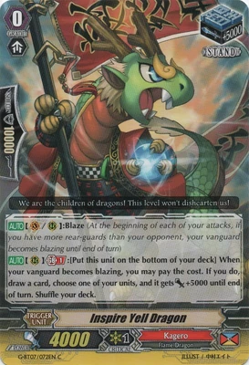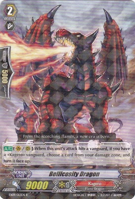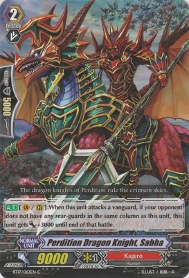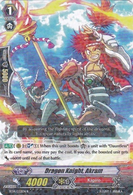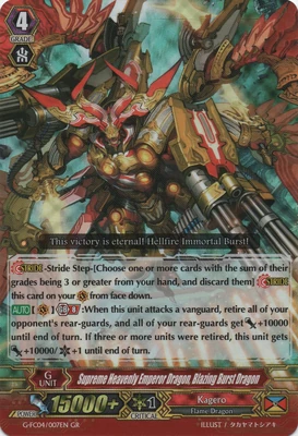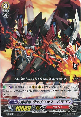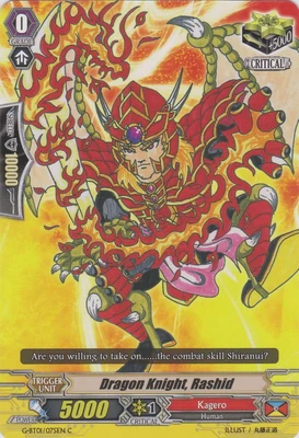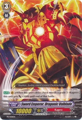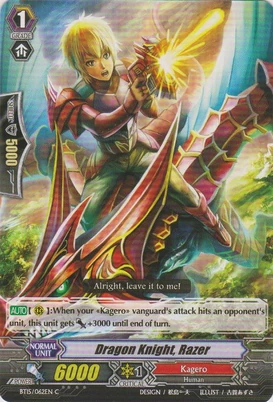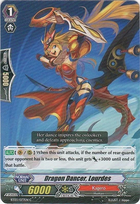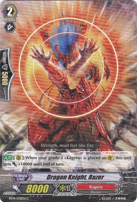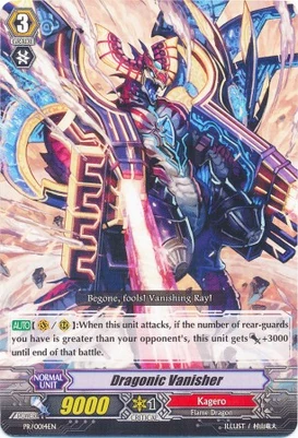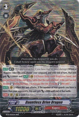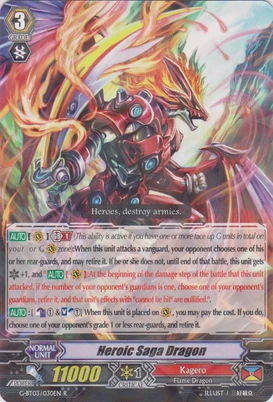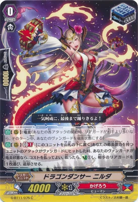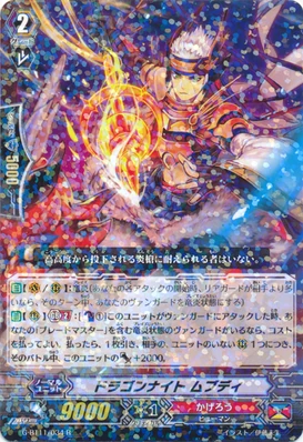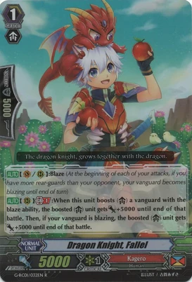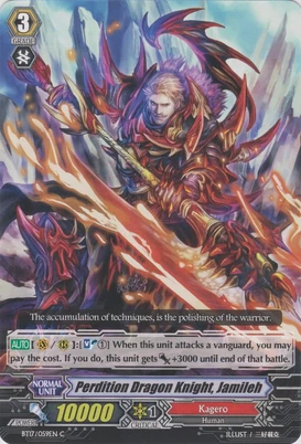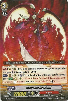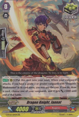 | Эффект: | АВТО 【Авангард/арьергард】: Пылание (в начале каждой Вашей атаки, если у Вас в арьергарде больше воинов, чем у оппонента, до конца хода Ваш авангард переходит в состояние Пылания). АВТО 【Арьергард】 [Один раз за ход]: когда арьергард оппонента отправляется на кладбище из-за Вашего эффекта, если у Вашего авангарда в имени содержится “Dragonic Blademaster”, до конца хода данный воин приобретает следующую способность: “АВТО 【Арьергард】: когда Ваш авангард переходит в состояние Пылания, активируйте Заряд счётчика 1 и до конца хода сила данного воина увеличивается на 4,000″. |