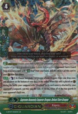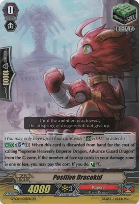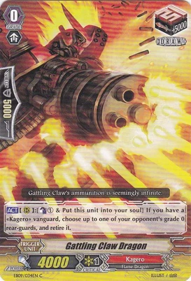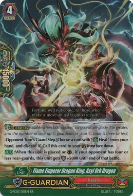 Всегда приятнее иметь триггер-эффект со способностью, нежели без неё, к тому же, это ещё и критический триггер, который Вы в любом случае будете использовать. Может быть использован для атаки/поддержки, после чего заменяет себя, попутно усиливая Ваш авангард и пополняя Вам душу, которая важна для таких воинов, как, например, Supreme Heavenly Emperor Dragon, Advance Guard Dragon и Flare Arms, Ziegenburg. Отказываться от этого воина нет причин.