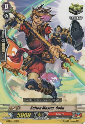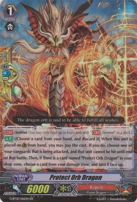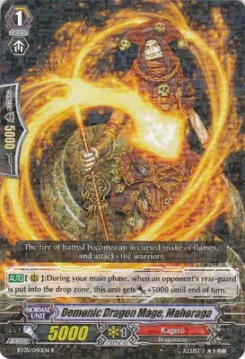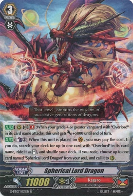 | Эффект: | АВТО 【Арьергард】: [Поместите данного воина в душу] Когда Ваш авангард атакует, если у него в имени содержится “Dragonic Blademaster”, Вы можете заплатить цену. Если Вы это сделаете, возьмите одну карту из колоды, выберите свой авангард и до конца битвы его сила увеличивается на 5,000. |