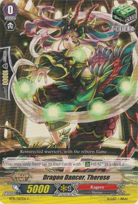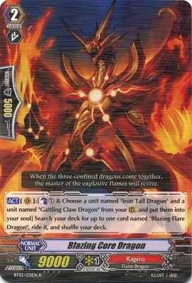 Наш основной 3ий ранг, который Вам всегда будет хотеться видеть в авангарде. Обладает Пыланием, чистит поле оппоненту, даёт Вам силу, а также позволяет легко брать с кладбища 3ий ранг, который потом можно использовать как для защиты, так и для вознесения, к тому же, способность эта работает как в Ваш ход, так и в ход оппонента, совершенно бесплатно давая Вам плюшки против кланов, не оставляющих поля, например против Бледной луны и Великих утопленников. К тому же, Импульс наследия 2 позволяет Вам максимально просто призвать Zeroth Dragon of Inferno, Drachma, если в этом есть необходимость, одна из очень немногих колод, где использование того дракона хоть как-то оправдано. Использовать обязательно четыре копии, ибо это центр колоды.