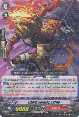 | Эффект: | АВТО: первопроходец (когда поверх этого воина помешается другой воин, относящийся к клану «Kagero», Вы можете призвать данного воина в арьергард). АКТ 【Арьергард】: [Поместите данного воина в душу] Выберите находящегося у Вас в авангарде воина, в имени которого содержится “Overlord”, и до конца хода он приобретает следующий эффект: “АВТО 【Авангард】: когда атака этого воина достигает цели, Вы можете выбрать одного находящегося в арьергарде оппонента воина и убрать его с поля”. |