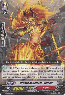 | Эффект: | АВТО 【Авангард/арьергард】: Пылание (в начале каждой Вашей атаки, если у Вас в арьергарде больше воинов, чем у оппонента, до конца хода Ваш авангард переходит в состояние Пылания). АВТО 【Авангард】: [Встречный взрыв 1] Когда Ваш воин наследия возносится, Вы можете заплатить цену. Если Вы это сделаете, выберите одного арьергарда оппонента и уберите его с поля, выберите одного своего воина со способностью Пылания и до конца хода его сила увеличивается на 3,000. АВТО 【Авангард】 Импульс наследия 2 (данная способность активируется лишь в том случае, если у Вас в зоне наследия и/или же в авангарде находятся как минимум два открытых воина наследия): в конце каждого хода, если у оппонента нет арьергарда, выберите у себя на кладбище до одной карты 3го ранга, обладающей способностью Пылания, и возьмите её в руку. |