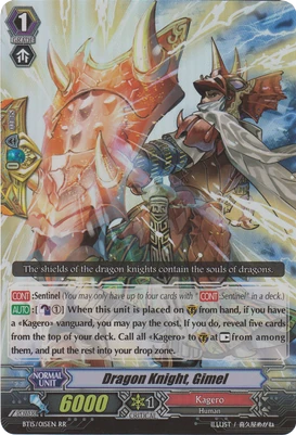 | Эффект: | АВТО 【Авангард】: Разрыв лимитов 4 (данный эффект доступен лишь при наличии хотя бы четырёх очков урона): когда этот воин атакует авангард оппонента, до конца боя его сила увеличивается на 5,000. АВТО 【Арьергард】: когда этот воин атакует авангард оппонента, если Ваш авангард относится к клану «Kagero», до конца битвы сила данного воина увеличивается на 2,000. | |