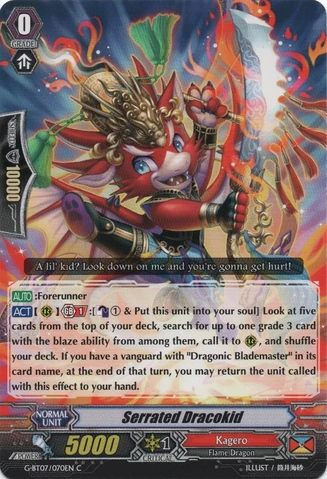 | Эффект: | АВТО: первопроходец (когда поверх этого воина призывается кто-либо из того же клана, Вы можете призвать данного воина в арьергард). АКТ 【Арьергард】 Импульс наследия 1 (данная способность активируется лишь в том случае, если у Вас в зоне наследия и/или же в авангарде находится как минимум один открытый воин наследия): [Встречный взрыв 1 & поместите данного воина в душу] Посмотрите пять верхних карт своей колоды, найдите среди них до одного воина 3го ранга или воина со способностью Пылания, призовите его в арьергард и перемешайте колоду. Если у Вашего авангарда в имени содержится “Dragonic Blademaster”, в конце хода Вы можете вернуть воина, призванного этой способностью, себе в руку. |