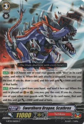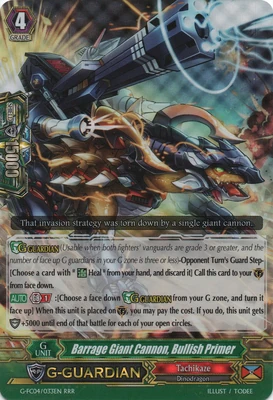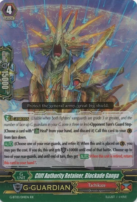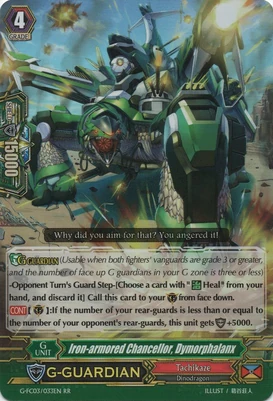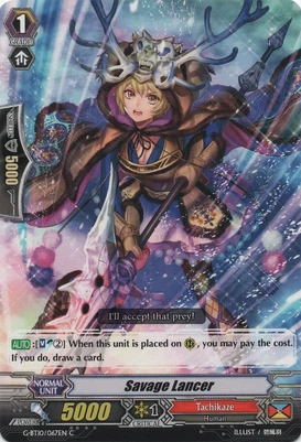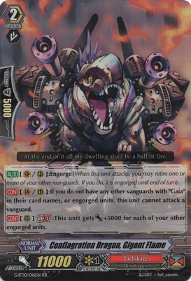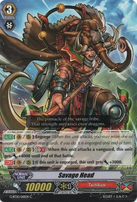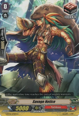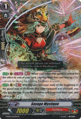 | Эффект: | АВТО 【Авангард/арьергард】: Свирепый хищник (когда этот воин атакует, Вы можете убрать с поля как минимум одного своего арьергарда. Если Вы уберете воина с поля, до конца хода этот воин становится Свирепым хищником). АВТО: Импульс наследия 1 (данная способность активируется лишь в том случае, если у Вас в зоне наследия и/или же в авангарде находится как минимум один открытый воин наследия): [Встречный взрыв 1 & Взрыв души 1] Когда этот воин призывается в арьергард, если в имени Вашего авангарда содержится “Gaia”, Вы можете заплатить цену. Если Вы это сделаете, до конца хода сила этого воина увеличивается на 2,000, и он приобретает следующую способность: “АВТО 【Арьергард】: когда этот воин становится Свирепым хищником, возьмите карту из колоды, и до конца хода сила этого воина увеличивается на 5,000″. |