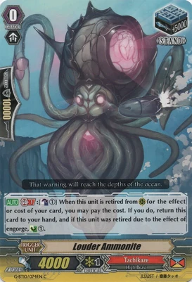 | Эффект: | АВТО 【Авангард】: Разрыв лимитов 4 (данный эффект доступен лишь при наличии хотя бы четырёх очков урона): когда этот воин атакует авангард оппонента, до конца боя его сила увеличивается на 5,000. АВТО 【Арьергард】: когда этот воин атакует авангард оппонента, если Ваш авангард относится к клану «Tachikaze», до конца битвы сила данного воина увеличивается на 2,000. | |