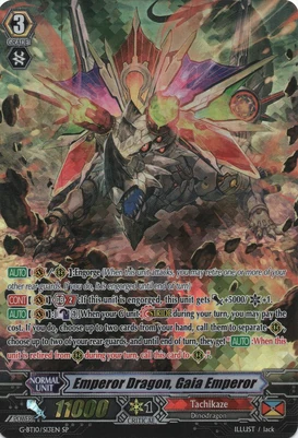Это колода, построенная вокруг двух наших сердец: Emperor Dragon, Gaia Emperor и Frenzy Emperor Dragon, Gaia Desperado. На данный момент является сильнейшей клановой колодой. Благодаря Tank Mammoth, обладает ранней игрой, а после выхода в вознесение, благодаря таким воинам, как, например, Emperor Dragon, Gaia Emperor, Great Cannon Dragon, Heavyarsen или Heavy Bullet Dragon, Diablo Cannon, позволяет Вам совершенно не уходить в минус по полю при жертвах и делать множество дополнительных атак. В целом, Гая делает всё то же, что пытаются делать другие клановые колоды, только лучше.