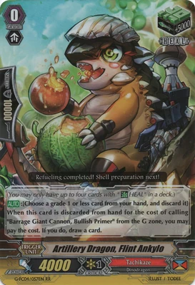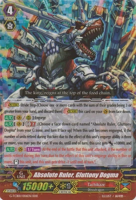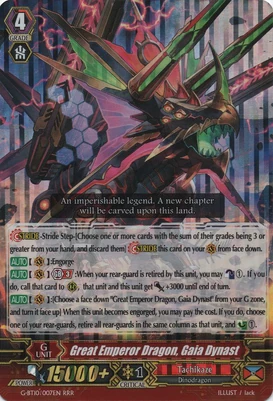 А вот вторая форма нашего Гаи как-то способностью не вышла. В авангарде этот воин чуток лучше, чем совершенно мёртвая смена, туда его призывать хочется в последнюю очередь, ибо Emperor Dragon, Gaia Emperor намно-о-ого лучше. Правда, стоит отметить, что в паре с Absolute Ruler, Gluttony Dogma даёт Вам +2 в руку за ход, но это не совсем то, что Вам обычно за наш клан хочется делать. В арьергарде смотрится получше из-за возможности или делать колонки в 21,000+ с поддержкой, или 16,000 самостоятельно. В целом, воин весьма средний и без сожалений заменяется чуть ли не любой более хорошей картой, но пока что эта более хорошая карта одна: Great Cannon Dragon, Heavyarsen, который, хоть и является совершенно мёртвой сменой [что, кстати, не намного-то хуже данного воина], зато в арьергарде даёт отличнейшую отдачу и на которого без проблем этого воина можно заменить.