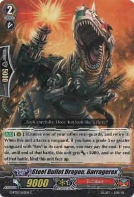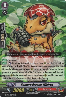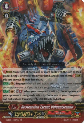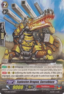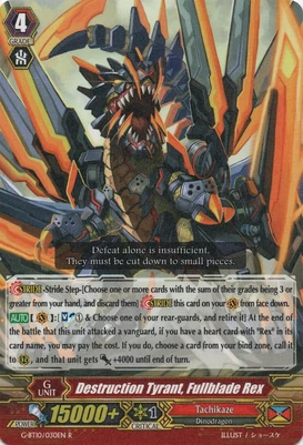 Даже в теории, этого воина использовать можно разве что в Гае, но зачем? Практически мёртвая смена, а из арьергарда это лишь голая сила, которую может дать более полезный в авангарде Frenzy Emperor Dragon, Gaia Desperado, к тому же, сам Frenzy Emperor Dragon, Gaia Desperado весьма уступает недавно появившемуся Great Cannon Dragon, Heavyarsen, который просто очень помогает с полем. В общем, этот дино-дракон внизу топа.