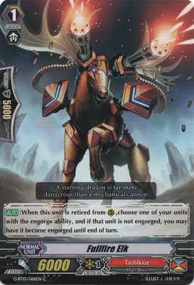 | Эффект: | АВТО 【Авангард/арьергард】: Свирепый хищник (когда этот воин атакует, Вы можете убрать с поля как минимум одного своего арьергарда. Если Вы уберете воина с поля, до конца хода этот воин становится Свирепым хищником). АВТО 【Авангард/арьергард】 Импульс наследия 1 (данная способность активируется лишь в том случае, если у Вас в зоне наследия и/или же в авангарде находится как минимум один открытый воин наследия): когда этот воин атакует авангард, до конца битвы сила данного воина увеличивается на 4,000. ПРОДОЛЖИТЕЛЬНЫЙ 【Авангард/арьергард】: когда этот воин находится в состоянии Свирепого хищника, его сила увеличивается на 3,000. |