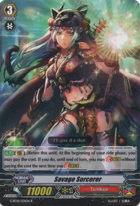 | Эффект: | АВТО 【Авангард/арьергард】: Свирепый хищник (когда этот воин атакует, Вы можете убрать с поля как минимум одного своего арьергарда. Если Вы уберете воина с поля, до конца хода этот воин становится Свирепым хищником). АВТО 【Арьергард】 Импульс наследия 1 (данная способность активируется лишь в том случае, если у Вас в зоне наследия и/или же в авангарде находится как минимум один воин наследия): когда этот воин становится Свирепым хищником, до конца хода его сила увеличивается на 5,000 за каждого воина, убранного с поля его собственной способностью. АВТО: [Встречный взрыв 1 & Взрыв души 1] Когда этот воин призывается в авангард, Вы можете заплатить цену. Если Вы это сделаете, посмотрите пять верхних карт своей колоды, найдите среди них до одного воина, обладающего способностью Свирепого хищника, покажите его оппоненту, возьмите его в руку и перемешайте колоду. |
