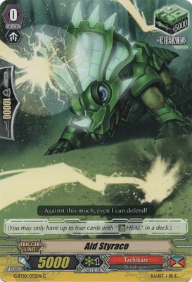 Бустеры: Booster Set 1: Descent of the King of Knights, Booster Set 2: Onslaught of Dragon Souls, Booster Set 3: Demonic Lord Invasion, Booster Set 8: Blue Storm Armada, Booster Set 11: Seal Dragons Unleashed, Booster Set 17: Blazing Perdition, G Booster Set 10: Raging Clash of the Blade Fangs, G Booster Set 13: Ultimate Stride.