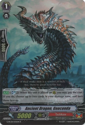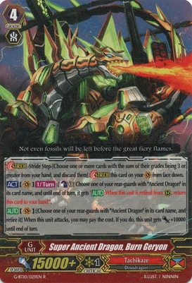 2. Колода, играющая через разрывную смену, то есть Ancient Dragon, Spinodriver + Ancient Dragon, Spinocommando. Суть в том, что благодаря Ancient Dragon, Spinocommando, Вы сможете каждый ход делать разрывную смену, получать карты в руку и пугать оппонента авангардом с двумя критическими, но в современной игре вознесение обычно просто лучше, так что подобная колода пусть и имеет место быть, но годится лишь для игры на интерес.