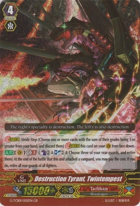 | Эффект: | АВТО 【Арьергард】 Импульс наследия 1 (данная способность активируется лишь в том случае, если у Вас в зоне наследия и/или же в авангарде находится как минимум один открытый воин наследия): [Встречный взрыв 1 & уберите с поля одного другого своего арьергарда] Когда этот воин атакует авангард, если этого воина поддерживают, Вы можете заплатить цену. Если Вы это сделаете, выберите до одного арьергарда оппонента, уберите его с поля, и до конца хода сила этого воина увеличивается на 5,000, и он приобретает следующую способность: “АВТО 【Арьергард】: когда атака этого воина достигает авангарда, возьмите одну карту из колоды”. |