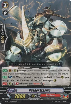 С этим воином и Rusher Erasmo есть забавная комбинация. Призываете данного воина в авангард, в арьергард призываете двух Rusher Erasmo и любого другого воина. Атакуете первым Rusher Erasmo и убираете с поля того “любого воина”. Потом атакуете вторым Rusher Erasmo и кушаете первого. Так как первый Rusher Erasmo был Свирепым хищником, Вы платите Взрыв души 1 и призываете его обратно на поле. Активируется способность данного воина и Вы активируете Заряд души 1. Затем атакуете вторым Rusher Erasmo и кушаете первого и, так как он тоже находился в состоянии Свирепого хищника, всё повторяется. Довольно забавно и можно атаковать, пока не кончится колода, при сложившихся звёздах можно даже оппонента там же и убить, но для этого нужно ходить первым и нужно чтобы оппонент не поймал ни одного триггера в урон, что маловероятно, но тем не менее, комбинация существует. Ни для чего другого этот мамонт, впрочем, не годится.
