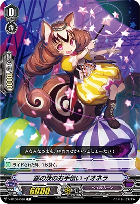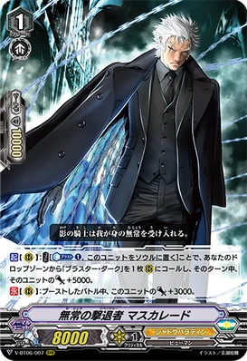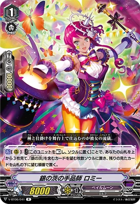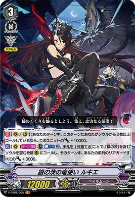 | Эффект: | АВТО 【Авангард/арьергард】: при помещении из руки, заплатите цену [Встречный взрыв 1], найдите у себя в колоде до одной карты, в имени которой содержится “Silver Thorn”, поместите её в свою душу и перемешайте колоду. АВТО 【Арьергард】: когда этот воин атакует авангард, если у Вас в душе как минимум четыре разноимённые карты, в именах которых содержится “Silver Thorn”, до конца битвы сила данного воина увеличивается на 10,000. |