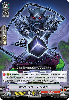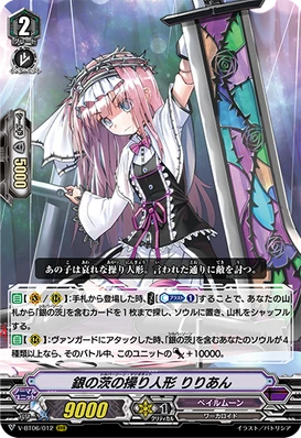 | Эффект: | ПРОДОЛЖИТЕЛЬНЫЙ 【Авангард/арьергард】: во время Вашего хода, если во время этого хода Вы призвали из своей души как минимум две карты, сила этого воина увеличивается на 10,000. АКТ 【Авангард】 [Один раз за ход]: заплатите цену [Встречный взрыв 2 & скиньте одну карту у себя из руки], призовите у себя из души в арьергард любое количество карт, в именах которых содержится “Silver Thorn”, и до конца хода сила всех арьергардов в Вашем переднем ряду увеличивается на 3,000. |