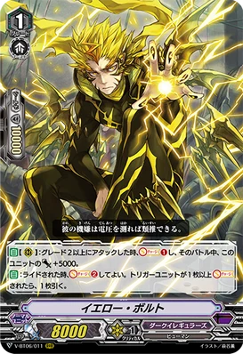 | Эффект: | АВТО 【Арьергард】: когда этот воин атакует воина 2го или выше ранга, активируйте Заряд души 1 и до конца битвы сила этого воина увеличивается на 5,000. АВТО: когда поверх данного воина совершается смена, Вы можете активировать Заряд души 2. Если Вы зарядили как минимум один триггер, возьмите одну карту из колоды. |