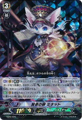 | Эффект: | АКТ 【Авангард】: Разрыв лимитов 4 (данный эффект доступен лишь при наличии хотя бы четырёх очков урона): [Встречный взрыв 2 “Liberator” & поместите одного находящегося у Вас в арьергарде воина, в имени которого содержится “Liberator”, в низ своей колоды] Посмотрите две верхние карты своей колоды, выберите до двух из них, призовите их в разные открытые круги арьергарда и до конца хода сила этих воинов увеличивается на 5,000, а остальные карты, если таковые имеются, поместите в низ колоды в любом порядке. АВТО 【Авангард】: когда этот воин атакует, до конца битвы его сила увеличивается на 2,000. |