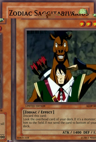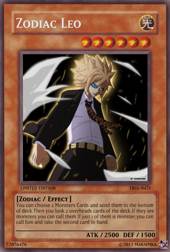 This monster cannot be summoned from the deck.Choose three of your "Zodiac" monsters on the field and send them to the bottom of your deck.If you do that-you can search Spell card-"Zodiac Spirit's world" and use him.If you used "Zodiac Spirit's world" and this monster is on the field-all of your "Zodiac" get 500ATK and 500DEF.