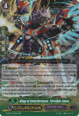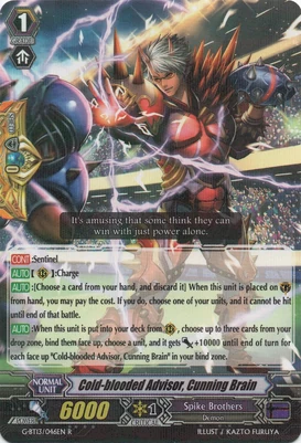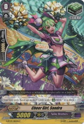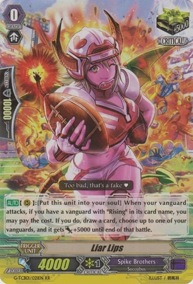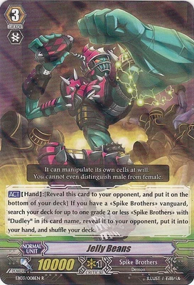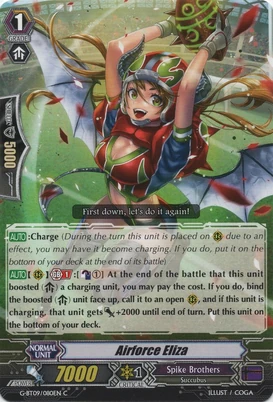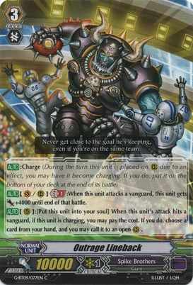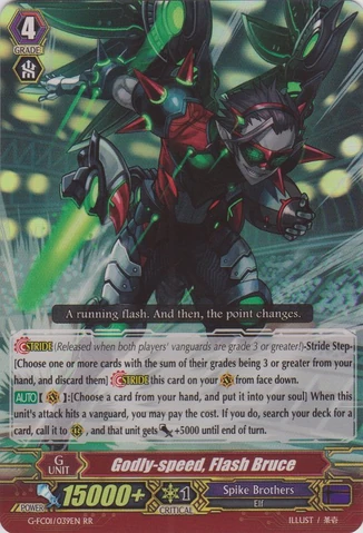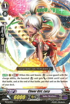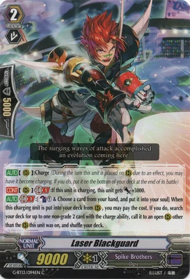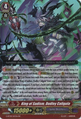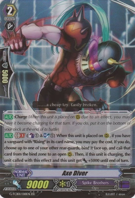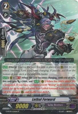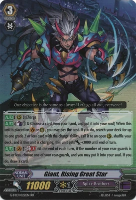 | Эффект: | АВТО 【Авангард】: в начале Вашей основной фазы – активируйте Заряд души 1. До конца этого хода атака данного воина увеличивается на 2,000. АВТО 【Авангард/арьергард】: [Взрыв души 8 & Встречный взрыв 5] Когда атака данного воина достигает цели, Вы можете заплатить цену. Если вы это сделаете, посмотрите на пять верхних карт своей колоды, выберите любое количество воинов, относящихся к клану «Spike Brothers» и призовите их в разные круги арьергарда. После этого перемешайте колоду. | |
