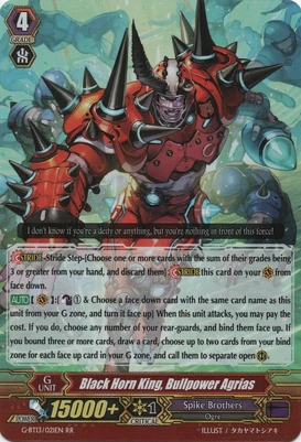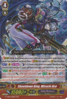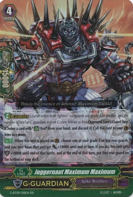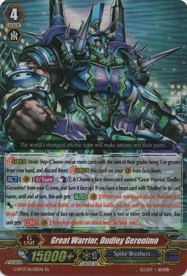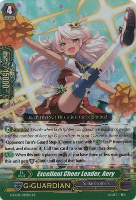 | Эффект: | АВТО 【Авангард】: Разрыв лимитов 4 (данный эффект доступен лишь при наличии хотя бы четырёх очков урона): когда этот воин атакует авангард оппонента, до конца боя его сила увеличивается на 5,000. АВТО 【Арьергард】: когда этот воин атакует авангард оппонента, если Ваш авангард относится к клану «Spike Brothers», до конца битвы сила данного воина увеличивается на 2,000. | |