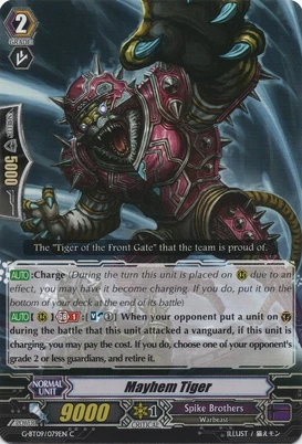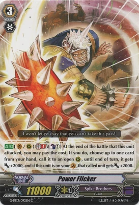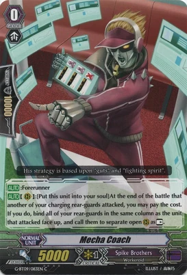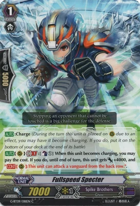 | Эффект: | АВТО: [Встречный взрыв 1] Когда данный воин призывается в арьергард во время боевой фазы, если Ваш авангард относится к клану «Spike Brothers», Вы можете заплатить цену. Если Вы это сделаете, до конца хода сила данного воина увеличивается на 5,000. | |
