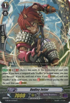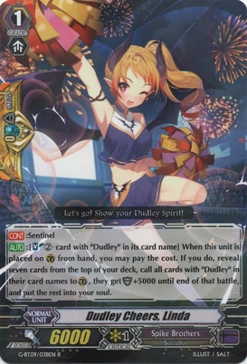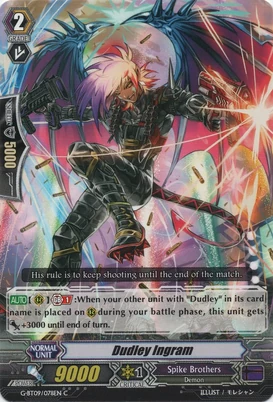 | Эффект: | АВТО 【Арьергард】 Импульс наследия 1 (данная способность активируется лишь в том случае, если у Вас в зоне наследия и/или же в авангарде находится как минимум один открытый воин наследия): во время Вашей боевой фазы, когда другой Ваш воин, в имени которого содержится “Dudley”, призывается в арьергард, до конца хода сила данного воина увеличивается на 3,000. |