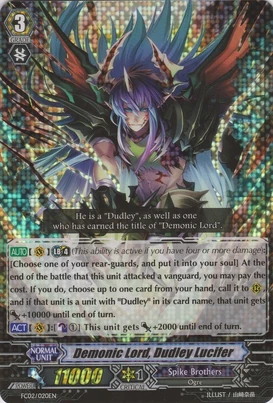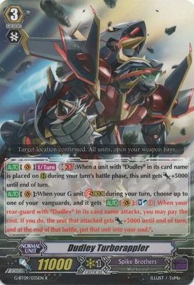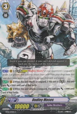 | Эффект: | АВТО: первопроходец (когда поверх этого воина призывается кто-либо из того же клана, Вы можете призвать данного воина в арьергард). АВТО 【Арьергард】: [Взрыв души 1] Когда атакует Ваш авангард, в имени которого содержится “Dudley”, Вы можете заплатить цену. Если Вы это сделаете, ограничьте данного воина в открытом положении, призовите эту карту в открытый круг арьергарда, и если у Вас в арьергарде находятся как минимум два других воина, в именах которых содержится “Dudley”, до конца хода сила данного воина увеличивается на 3,000. |