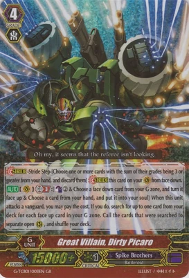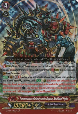 | Эффект: | АВТО 【Авангард】: Разрыв лимитов 4 (данный эффект доступен лишь при наличии хотя бы четырёх очков урона): [Встречный взрыв 2 & скиньте из руки одного Grateful Catapult] Когда этот воин атакует авангард оппонента, Вы можете заплатить цену. Если Вы это сделаете, выберите до двух воинов клана «Spike Brothers», находящихся у Вас в колоде; призовите их в разные пустые круги арьергарда, а затем перемешайте колоду. ПРОДОЛЖИТЕЛЬНЫЙ 【Авангард/арьергард】: лидер (если у Вас на поле находится кто-либо, не относящийся к клану этого воина, данный воин не может атаковать.) | |