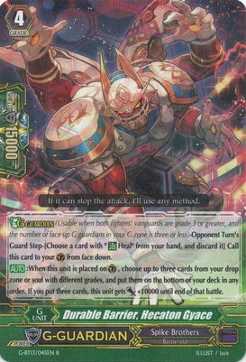 Лучший исцеляющий триггер клана. Даёт Вам ресурсы просто за призыв стража наследия, за бой может дать до двух ресурсов, что вполне неплохо. Правда, стоит отметить, что это исцеление не очень хорошо сочетается с Durable Barrier, Hecaton Gyace, так как из карт 0го ранга Вы тем стражем наследия скорее всего предпочтете возвращать в колоду именно исцеляющие триггеры, что не позволит им задерживаться на кладбище. Но даже так, наш клан слишком быстро тратит Встречные взрывы, чтобы игнорировать возможность настолько легкого их восстановления. Кроме того, данный воин обладает архетипным именем, что позволяет находить его в колоде способностью Jelly Beans. Особенно эта возможность полезна в колоде на Импульсе наследия 8, которая с выходом этого исцеления стала ну ОЧЕНЬ стабильной. Единственная колода, где Вы, возможно, захотите использовать другой исцеляющий триггер, это колода на Восходящем через Shootdown King, Miracle Ace, в которой неплохо смотрится Reserver Linus, так как он, в отличие от этого исцеления, способен заполнять душу для Импульса наследия 3 Shootdown King, Miracle Ace уже при первом использовании стража наследия.