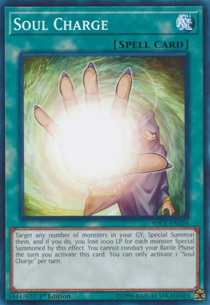 | Эффект: | Вы можете активировать лишь одну копию карты Soul Charge за ход. 1. Выберите любое количество монстров, находящихся у Вас на кладбище; специально вызовите их и, если Вы это сделаете, Ваши жизненные пункты снижаются на 1000 за каждого специально вызванного этим эффектом монстра. 2. Вы не можете вступать в боевую фазу во время хода, в котором Вы активировали эту карту. |