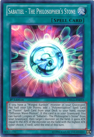 | Эффект: | 1. Если у Вас на кладбище находится монстр серии Winged Kuriboh: заплатите половину своих жизненных пунктов; добавьте одну магию серии Polymerization или Fusion из своей колоды в руку, за исключением Diffusion Wave-Motion. 2. Если эта карта находится на Вашем кладбище: Вы можете убрать со своего кладбища три копии карты Sabatiel – The Philosopher’s Stone, затем выбрать одного монстра, находящегося на поле; до конца хода его атака увеличивается на количество атаки монстра, чья атака является наивысшей (если на поле таких монстров несколько, выбираете Вы). |